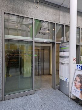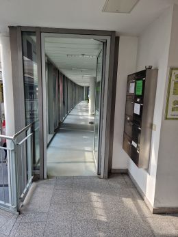 Wo sonntags der Aufsteller steht, der zum Gottesdienst um 10 Uhr einlädt, geht es zum Fahrstuhl, der in die 1. Etage führt.