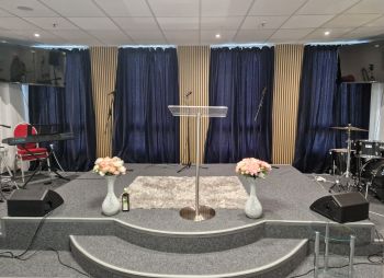 Und dann verbirgt sich hinter der ersten Tür der Kirchraum der Berliner Dunamis - Gemeinde.