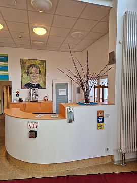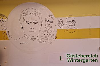 Auf dem Flur wird mit großer Schrift darauf hingewiesen, was es hier im Hause alles gibt.