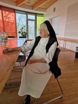 Sie erzählte, dass sie immer wieder von den Jugendlichen gefragt wurde, warum sie ein weißes Kleid trägt und ihre langjährige Mitschwester Margareta ein graues. Ja, weil sie in der Küche arbeite. Wir fragten, ob sie uns verräte, wie alt sie wäre. "Demnächst 2 Krücken", war ihre Antwort, die sie uns aber erst erklären musste: 77.