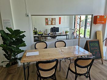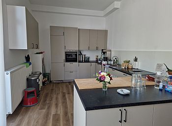 Auf der gegenüberliegenden Seite des Raumes befindet sich diese große, schön eingerichtete offene Küche, in der gemeinsam gekocht werden kann - ein sehr beliebtes Mittel, die neuen Nachbarn in der Nähe kennenzulernen.