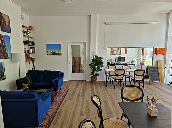 Ein großes Fenster gibt den Blick ins Büro frei, wie überhaupt die großen Fenster von außen einsehbar machen, was und wer sich hier trifft.