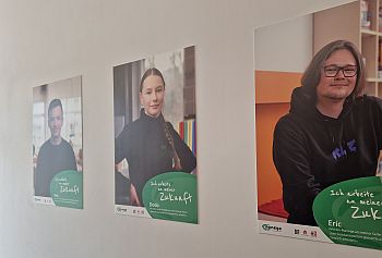 "Ich arbeite an meiner Zukunft" steht auf den großen Plakaten, gestaltet von der Manege-Schule, die im Eingangsbereich und Fluren die Wände farbenfroh gestalten.