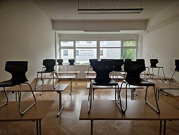 Jetzt um 15:15 Uhr sind alle Stühle hochgestellt, weil jeden Tag hier der Fußboden gereinigt wird. Die jungen Menschen sollen spüren, dass sie willkommen sind und wertgeschätzt werden.