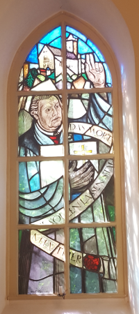 Auf der linken Seite weisen die Fenster auf Paul Gerhardt, Wichern und Luther hin und damit auf das, was der Gemeinde wichtig ist: das Lob Gottes durch Gesang und Musik, die tätige Nächsten liebe und Sorge für die Benachteiligten und das vierfache Solus Luthers: „sola scriptura "- allein die Schrift, „sola fide“ allein durch den Glauben. „sola gratia"- allein durch Gnade, „solus Christus“ - allein Christus.