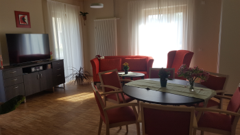 Auch hier empfängt uns wieder ein freundlicher Tagesraum mit dem Blick ins Grüne mit einer Terrasse davor.