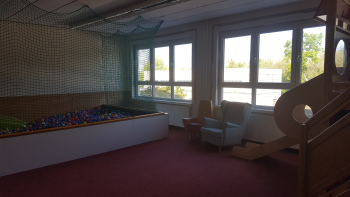 Das Spielzimmer bietet viel Raum zur Bewegung, auch einen großen Bällepool hier gegenüber zum „Baden“.