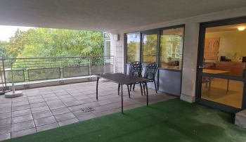 In der 2. Etage ist ein Innenhof mit einer großen überdachten Terrasse, daneben das Wohnzimmer