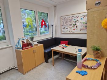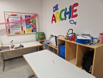 Durch den hinteren Eingang kommt man in der 1. Etage direkt zu dem Raum, in dem Mitarbeiter der "Arche" Angebote für die Kinder bereithalten: montags bis donnerstags von 8:30 - 16:30 und freitags von 9:00-17:00 Uhr. Keins der Kinder ist hier angemeldet, wie es im Hort der Fall ist. Sie kommen aus Eigeninitiative. Ca. 80 sind es die Woche und die Mitarbeitenden kennen sie persönlich mit Namen.