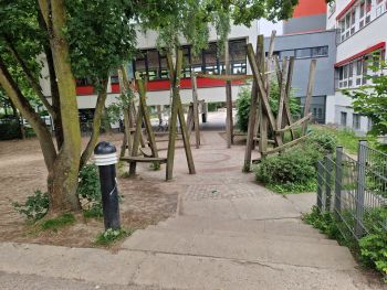 Auch auf der anderen Seite des Schulgeländes gibt es eine große Fläche zum Klettern und sich bewegen, die nachmittags auch von den Hortkindern rege genutzt werden.