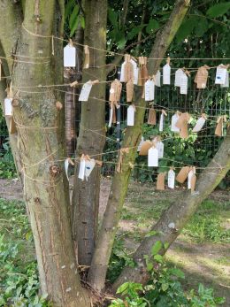 An einem Baum hängen Kärtchen mit Gebetswünschen von der Einweihungsfeier.
