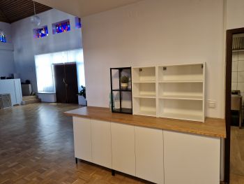 Auf dem Weg zum Kirchraum kommt man an diesem Regal vorbei, auf dem künftig ein Kaffeeautomat stehen soll und an dem man sich mit Getränken bedienen kann.