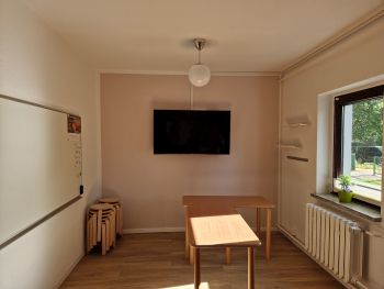 Von hier kommt man in den Raum für die Jugend und Konfirmanden. An der Stirnseite ist ein großer Bildschirm an der Wand, wie in allen Räumen hier.