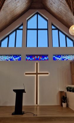 Sonntags kommen ca. 70 Erwachsene zum Gottesdienst um 12 Uhr, bei besonderen Gelegenheiten auch mehr und dann werden auch hier Stühle gestellt und man kann durch die Glaswand und den großen Bildschirm über der Tür den Gottesdienst mitverfolgen und mitfeiern.