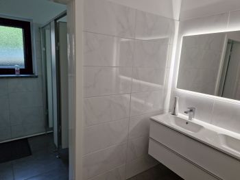 Die Toilettenräume sind voll saniert und erneuert worden. Die neuen Fliesen und Spiegel glänzen.