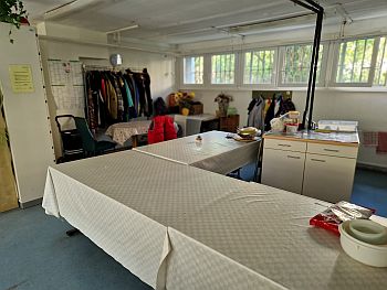 Frauen sind gerade beim Sortieren und Aussortieren von nicht mehr Brauchbarem dabei. An den Wänden stehen Schilder, wo was zu stehen bzw. zu finden ist.