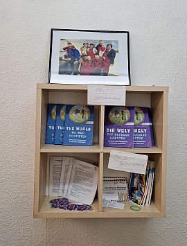 Daneben hängt ein Bord mit Info-Schriften zum Mitnehmen, auf dem ein Foto des Teams mit Jörg Pilawa steht, der seit 2019 Botschafter der "Tafeln" ist und sie hier 2024 besuchte, worüber man sich natürlich gefreut hat.